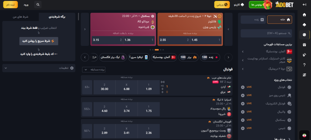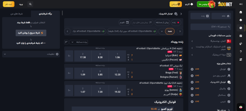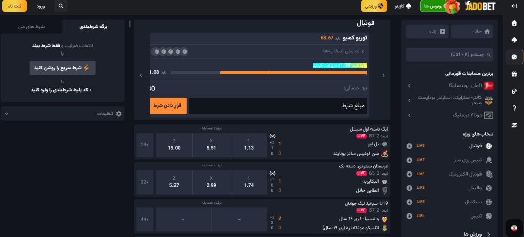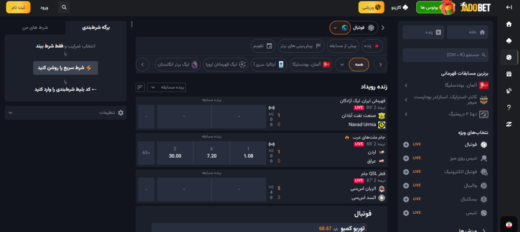 | ثبت شرط در طول بازی | امکان پیش بینی نتیجه، گل بعدی، کرنر و کارت زرد |